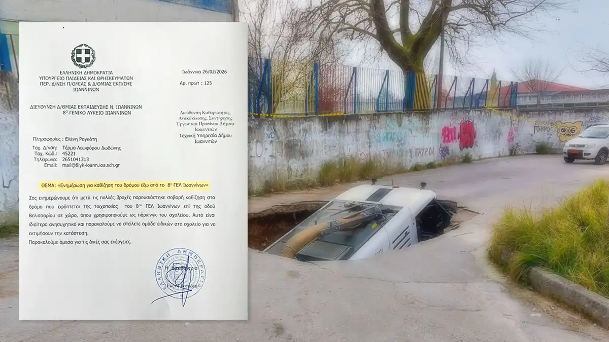 Από τις 26 Φεβρουαρίου, είχε ειδοποιήσει η διεύθυνση του 8ου Γενικού Λυκείου Ιωαννίνων τη δημοτική αρχή για τον κίνδυνο καθίζησης στο σημείο όπου το πρωί της Τετάρτης το έδαφος… ρούφηξε το όχημα καθαριότητας του Δήμου Ιωαννιτών.