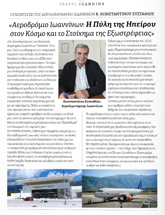 Τον ρόλο του Αεροδρομίου Ιωαννίνων ως βασικής πύλης εξωστρέφειας για την Ήπειρο και μοχλού τουριστικής και αναπτυξιακής δυναμικής αναδεικνύει ο Αερολιμενάρχης Ιωαννίνων, κ. Κωνσταντίνος Ευσταθίου, σε δήλωσή του στο Travel Ioannina του Ciao Magazine.