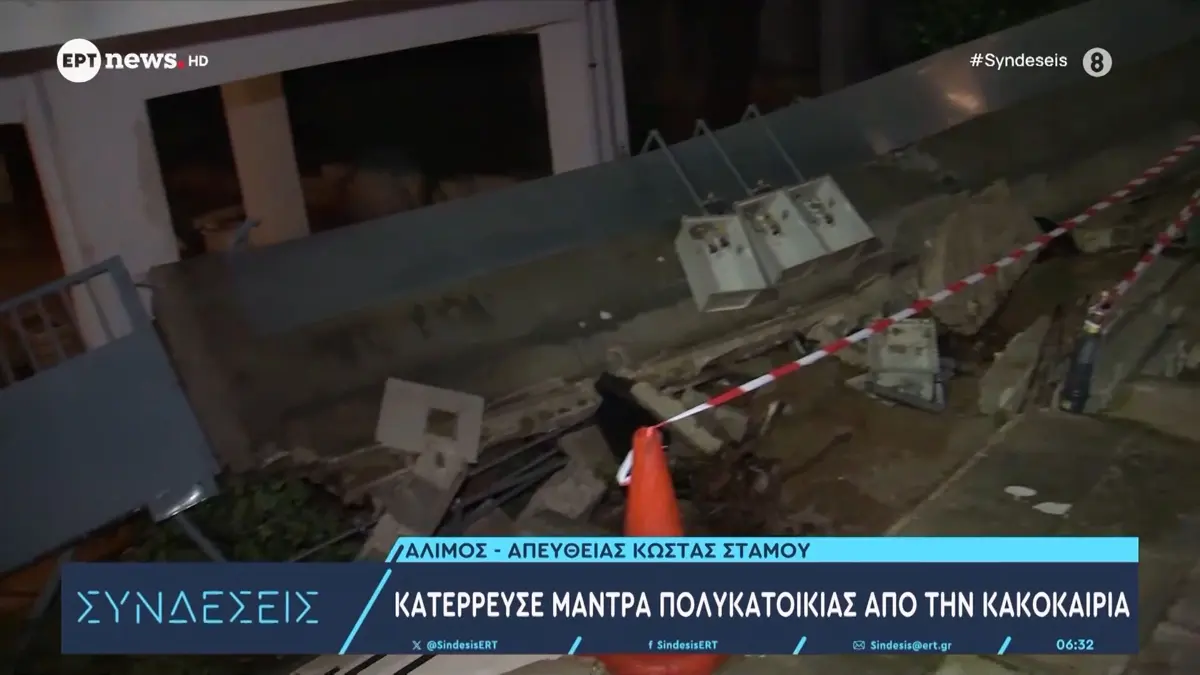 Στην περιοχή του Αλίμου, και συγκεκριμένα στην οδό Λυσικράτους, τα ορμητικά νερά μετέτρεψαν τον δρόμο σε χείμαρρο μέσα σε λίγα λεπτά, με αποτέλεσμα να καταρρεύσει μαντρότοιχος πολυκατοικίας από μπετόν. Η κατάρρευση προκάλεσε ζημιές σε ρολόγια της ΔΕΗ, σωληνώσεις και την είσοδο του κτιρίου, ενώ μεγάλες ποσότητες νερού και λάσπης εισέβαλαν στο εσωτερικό.