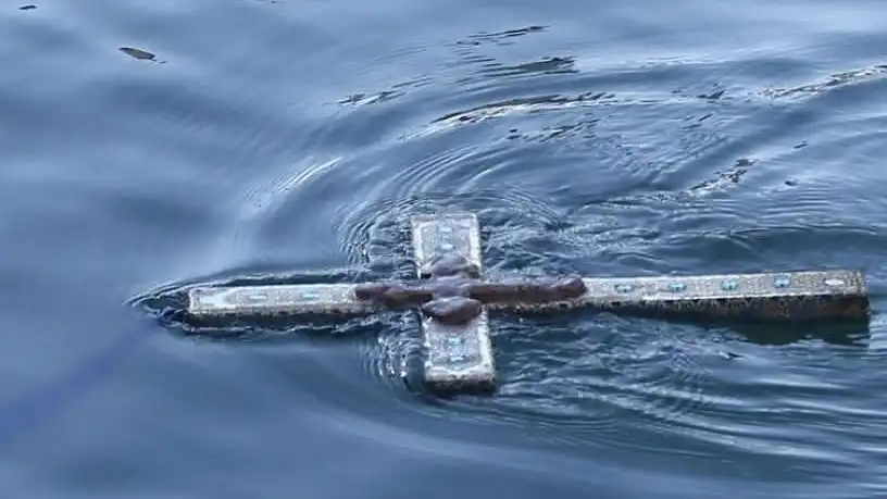 Αμέσως μετά, αψηφώντας μην τον πάρει είδηση κάποια εχθρική περίπολος, κατέβηκε, σαν σκιά, στη θάλασσα και βούτηξε το σταυρό, σιγοψάλλοντας: «Εν Ιοδράνη Βαπτιζομένου σου Κύριεε…»..