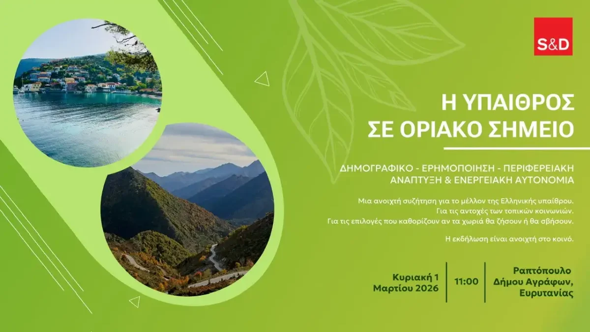 Η Ομάδα των Σοσιαλιστών & Δημοκρατών στο Ευρωπαϊκό Κοινοβούλιο και ο ευρωβουλευτής του ΠΑΣΟΚ – S&D Σάκης Αρναούτογλου διοργανώνουν την Κυριακή 1 Μαρτίου 2026, στις 11:00, στο Ραπτόπουλο Ευρυτανίας (Δήμος Αγράφων) εκδήλωση με θέμα: «Η Ύπαιθρος σε Οριακό Σημείο: Δημογραφικό, Ερημοποίηση, Περιφερειακή Ανάπτυξη & Ενεργειακή Αυτονομία».