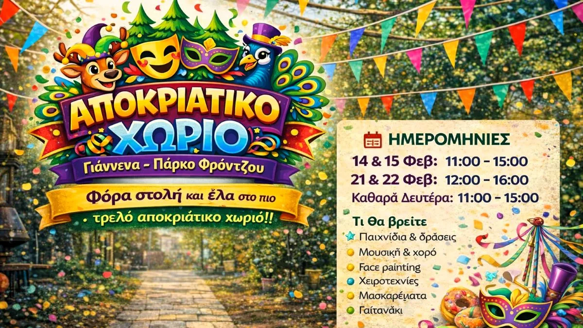 Μετά τη μεγάλη προσέλευση του κοινού το Σαββατοκύριακο 14 και 15 Φεβρουαρίου, το Αποκριάτικο Χωριό στο Ψυχαγωγικό Πάρκο Φρόντζου στα Ιωάννινα συνεχίζεται και το επόμενο τριήμερο, προσφέροντας δράσεις για παιδιά και οικογένειες.