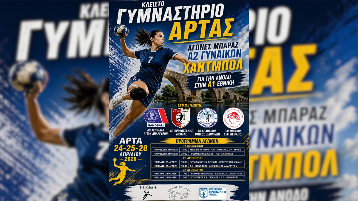 Στο Κλειστό Γυμναστήριο του Δημοτικού Αθλητικού Κέντρου Άρτας θα διεξαχθούν οι αγώνες χειροσφαίρισης μπαράζ Β Φάσης Α2 Γυναικών για άνοδο στην Α1 Εθνική κατηγορία στις 24-25 και 26 Απριλίου.