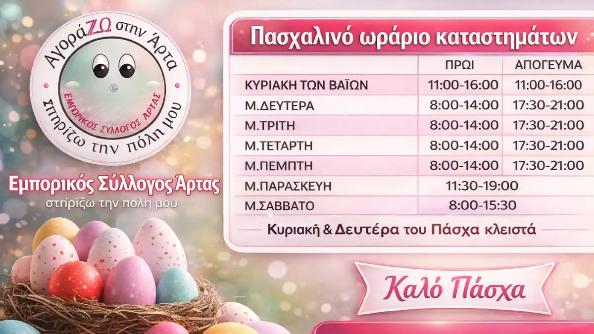 Το πασχαλινό ωράριο λειτουργίας των καταστημάτων ανακοίνωσε ο Εμπορικός Σύλλογος Άρτας, καλώντας τους καταναλωτές να στηρίξουν την τοπική αγορά ενόψει των εορτών.