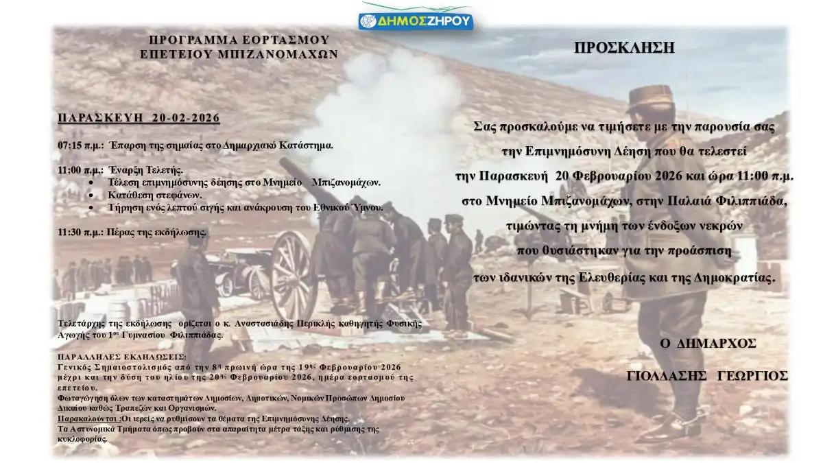 Ο Δήμος Ζηρού προσκαλεί τους πολίτες να τιμήσουν με την παρουσία τους τον Εορτασμό της Επετείου των Μπιζανομάχων, που θα πραγματοποιηθεί την Παρασκευή 20 Φεβρουαρίου 2026 και ώρα 11:00 π.μ., στο Μνημείο Μπιζανομάχων, στην Παλαιά Φιλιππιάδα.