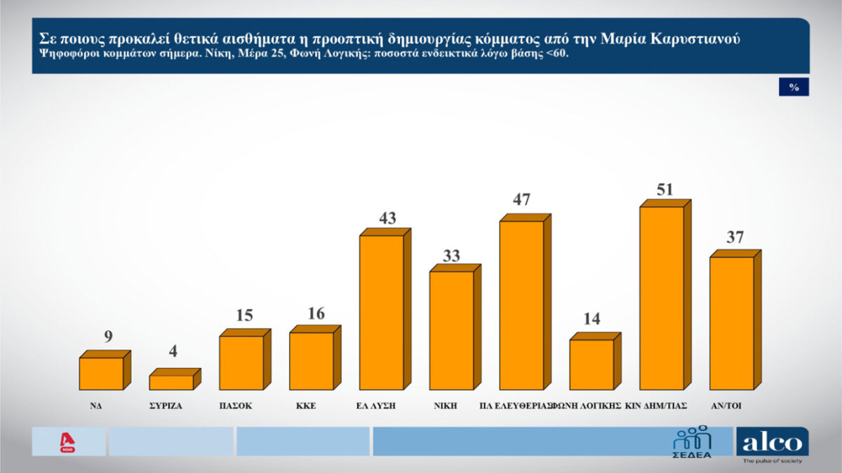 Αντίστοιχα, θετικά κρίνει ένα τέτοιο ενδεχόμενο το 51% των ψηφοφόρων του Κινήματος Δημοκρατίας, το 47% των ψηφοφόρων της Πλεύσης Ελευθερίας, το 43% των ψηφοφόρων της Ελληνικής Λύσης και το 33% των ψηφοφόρων της ΝΙΚΗΣ.