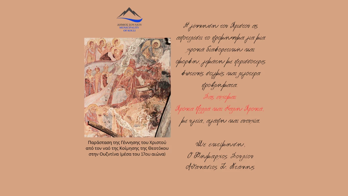 Ο Δήμαρχος Σουλίου Αθανάσιος Ντάνης, με αφορμή τη γιορτή των Χριστουγέννων, εκφράζει τις θερμότερες ευχές του προς τους κατοίκους του δήμου και όλους τους συμπολίτες του.