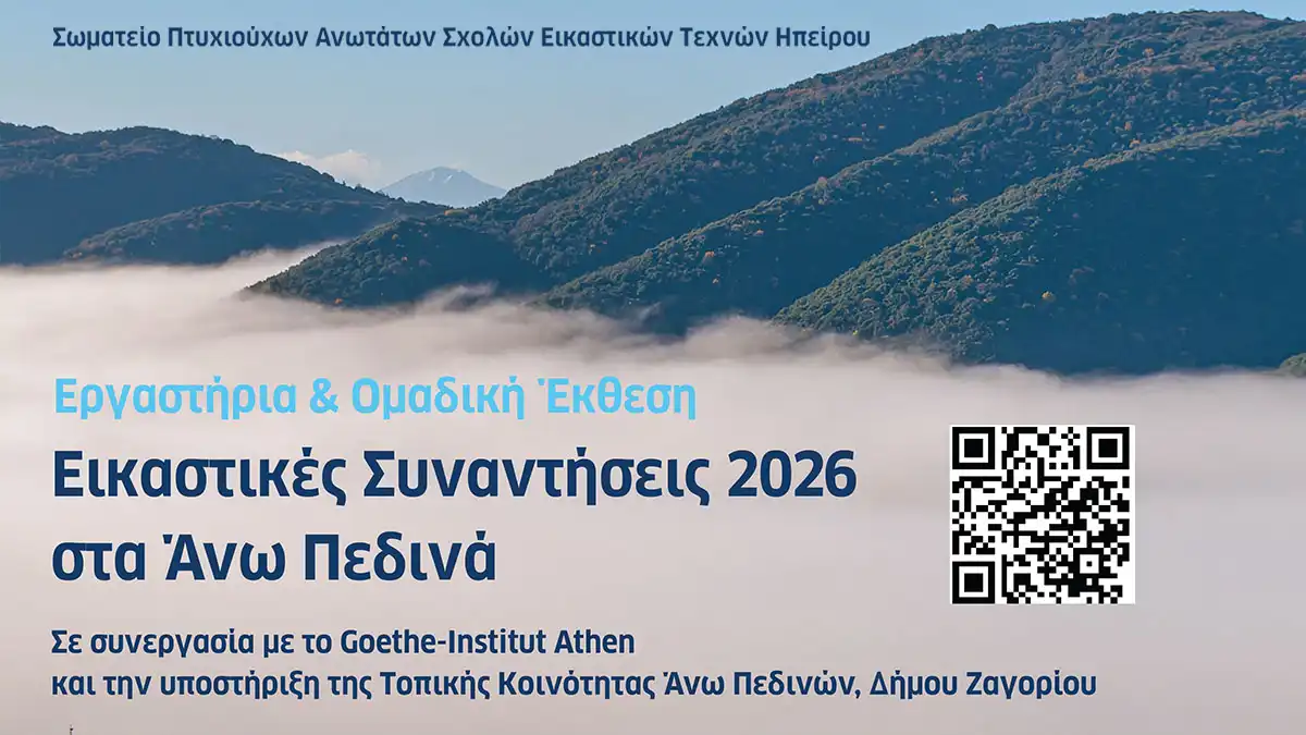 Το Goethe-Insitut Athen σε συνεργασία με το Σωματείο Πτυχιούχων Ανωτάτων Σχολών Εικαστικών Τεχνών Ηπείρου σας προσκαλεί στην Ομαδική Εικαστική Έκθεση με παράλληλα μαθητικά εργαστήρια στα Άνω Πεδινά Ζαγορίου.