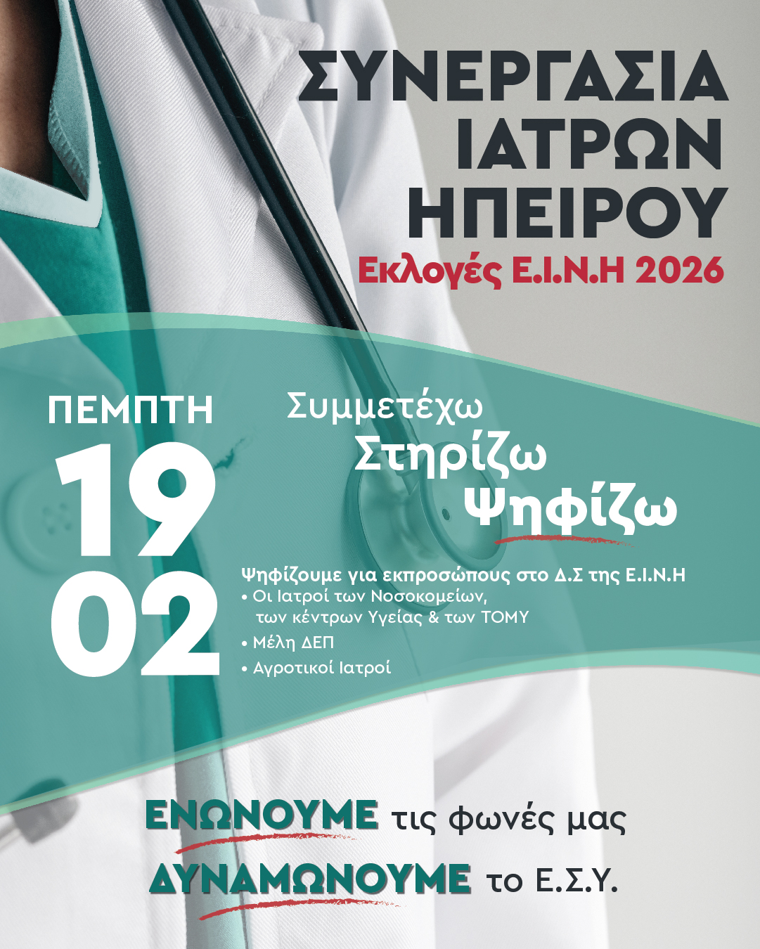 Η παράταξη καλεί τους νοσοκομειακούς γιατρούς να συμμετάσχουν στην εκλογική διαδικασία της 19ης Φεβρουαρίου και να στηρίξουν το ψηφοδέλτιό της.