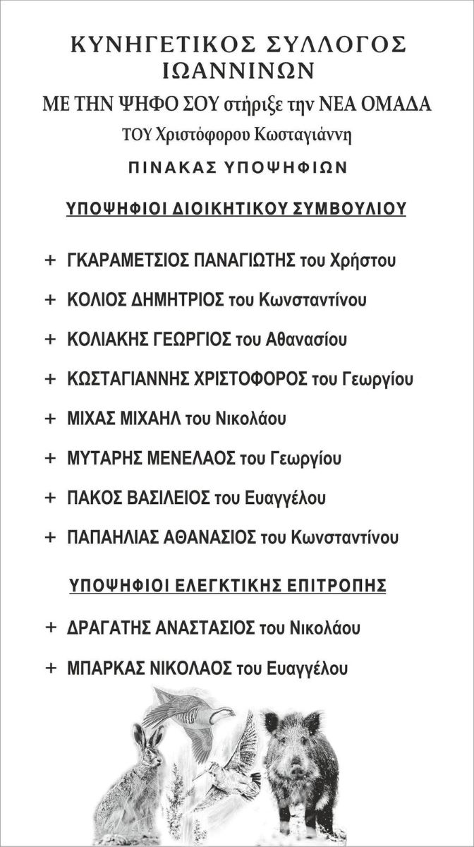 Στις εκλογές του Κυνηγετικού Συλλόγου Ιωαννίνων, που θα πραγματοποιηθούν στις 26 Απριλίου στα Λιθαρίτσια, κατεβαίνει μια νέα ομάδα υποψηφίων με επικεφαλής τον Χριστόφορο Κωσταγιάννη.