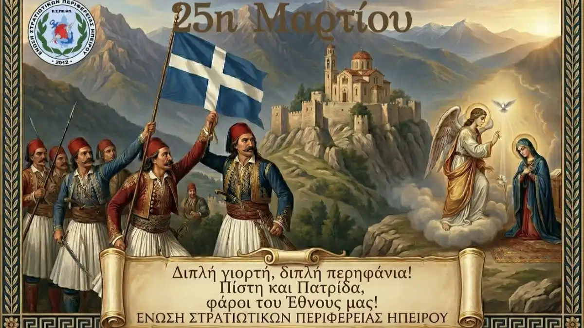 Με αφορμή τον εορτασμό της 25ης Μαρτίου, η Ένωση Στρατιωτικών Περιφέρειας Ηπείρου στέλνει μήνυμα τιμής και μνήμης για την Ελληνική Επανάσταση του 1821, αναδεικνύοντας τα ιδανικά της ελευθερίας και της θυσίας που τη συνόδευσαν.