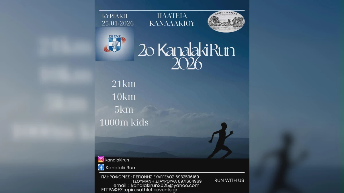 Ο Δήμος Πάργας, σε συνεργασία με τον ΣΕΓΑΣ, ανακοινώνει τη διεξαγωγή του 2ου Kanalaki Run, το οποίο θα πραγματοποιηθεί την Κυριακή 25 Ιανουαρίου 2026 με αφετηρία την Πλατεία Καναλακίου.