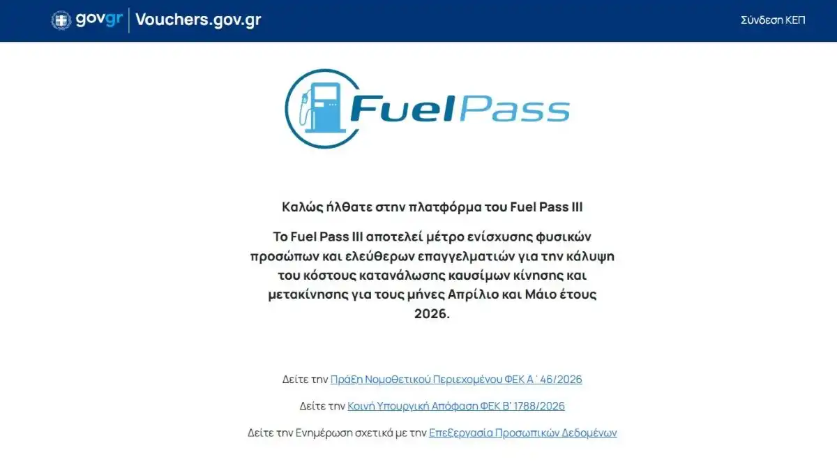 Ανοιχτή έως και την 30/4/2026, για όλους τους πολίτες, ανεξαρτήτως του λήγοντος αριθμού του Α.Φ.Μ. τους, θα παραμείνει η πλατφόρμα ώστε να υποβάλλουν την αίτησή τους μέσω gov.gr για το fuel pass. Μέχρι και χθες νωρίς το απόγευμα, οι αιτήσεις ξεπερνούσαν τις 2.550.000.