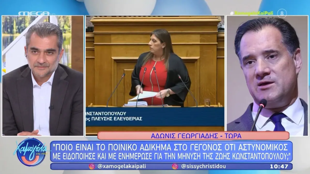Το πρωί της Κυριακής (16.2.26) ο Άδωνις Γεωργιάδης έκανε παρέμβαση στην εκπομπή «Χαμογέλα και πάλι» στο Mega με αφορμή το ρεπορτάζ που μεταδόθηκε για την κόντρα του με την Ζωή Κωνσταντοπούλου. Μετά την παρέμβαση του υπουργού Υγείας ακολούθησε και παρέμβαση της προέδρου της Πλεύσης Ελευθερίας.