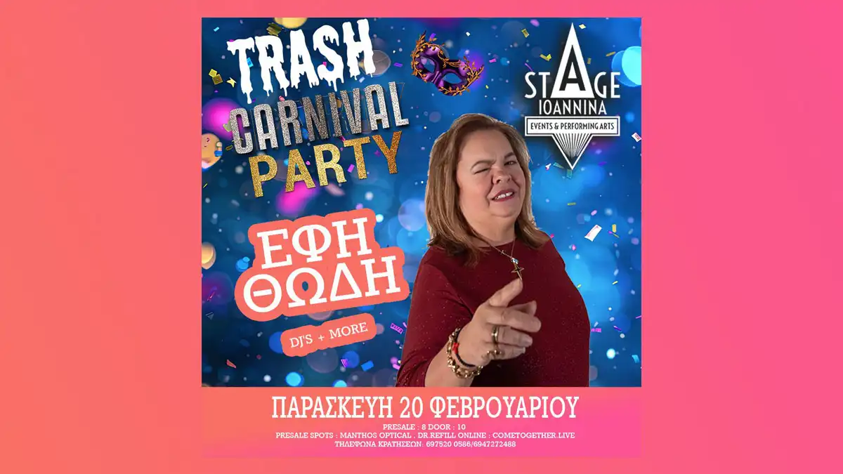 Αποκριάτικο κλίμα, χορός μέχρι το πρωί και… trash διάθεση υπόσχεται το Carnival Trash Party, που έρχεται την Παρασκευή 20 Φεβρουαρίου 2026 στο Stage Ioannina. Το Carnival Trash Party φιλοδοξεί να αποτελέσει ένα από τα μεγαλύτερα πάρτι των φετινών Αποκριών στην πόλη, με guest εμφάνιση της Έφης Θώδη και DJ sets.