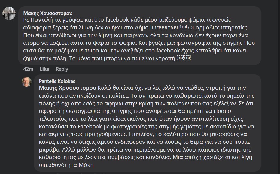 Να πάρει μια απόχη… και να καθαρίσει τη Λίμνη από τα νεκρά ψάρια προτρέπει σε διαδικτυακό τους διάλογο τον αντιδήμαρχο Καθαριότητας Μάκη Χρυσοστόμου, ο επικεφαλής της παράταξης “Γιάννενα Όμορφη Πόλη” Παντελής Κολόκας.