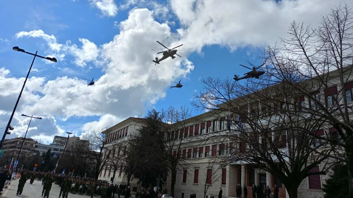 Εντυπωσιακή ήταν και η εναέρια παρουσία, με ελικόπτερα Apache και μαχητικά αεροσκάφη F-16 να πραγματοποιούν διελεύσεις πάνω από την πόλη, κερδίζοντας το ενδιαφέρον των πολιτών.