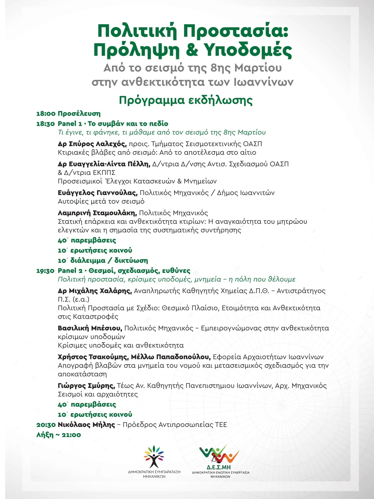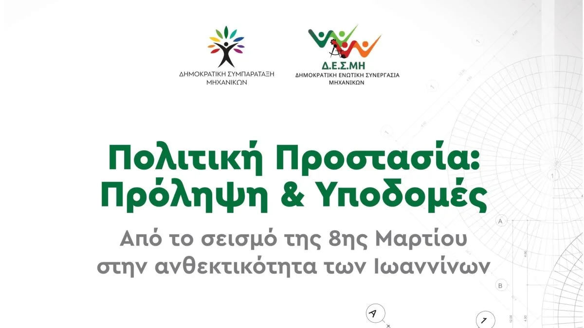 Η Δημοκρατική Ενωτική Συνεργασία Μηχανικών Ηπείρου – Λευκάδας (Δ.Ε.Σ.ΜΗ.) και η Δημοκρατική Συμπαράταξη Μηχανικών (ΔΗ.ΣΥ.Μ.) διοργανώνουν από κοινού εκδήλωση με θέμα την πολιτική προστασία, την πρόληψη και τις υποδομές, με αφορμή τον σεισμό της 8ης Μαρτίου και την ανθεκτικότητα της περιοχής των Ιωαννίνων.