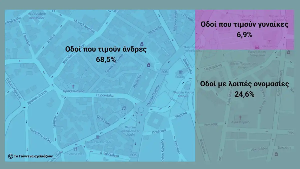 Η ανάλυση βασίστηκε σε στοιχεία από ταχυδρομικούς κώδικες και δεδομένα του Google Maps, εξετάζοντας συνολικά 765 οδούς στην πόλη των Ιωαννίνων. Τα αποτελέσματα δείχνουν έντονη ανισορροπία στην ονοματοδοσία.