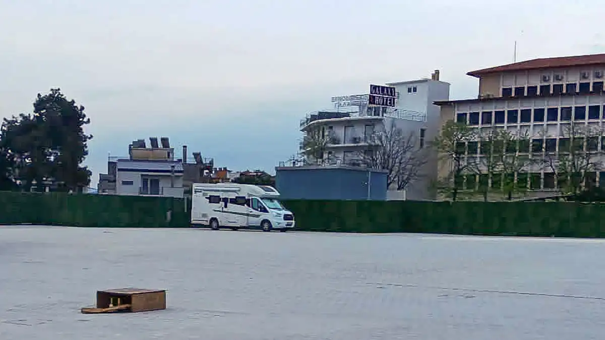 Στο μέσο της πλατείας, ένα αυτοκινούμενο τροχόσπιτο παρέμενε σταθμευμένο από το βράδυ της Μεγάλης Παρασκευής, συνθέτοντας μια εικόνα που δύσκολα περνούσε απαρατήρητη το πρωί του Μεγάλου Σαββάτου.