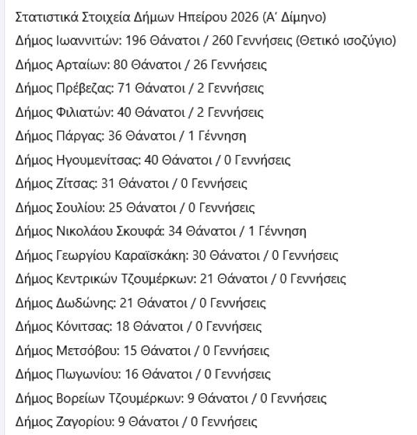 Την ίδια στιγμή, σε σειρά δήμων δεν έχει καταγραφεί καμία γέννηση το 2026 μέχρι στιγμής. Μεταξύ αυτών περιλαμβάνονται οι δήμοι Ηγουμενίτσας, Ζίτσας, Σουλίου, Γεωργίου Καραϊσκάκη, Κεντρικών Τζουμέρκων, Δωδώνης, Κόνιτσας, Μετσόβου, Πωγωνίου, Βορείων Τζουμέρκων και Ζαγορίου.