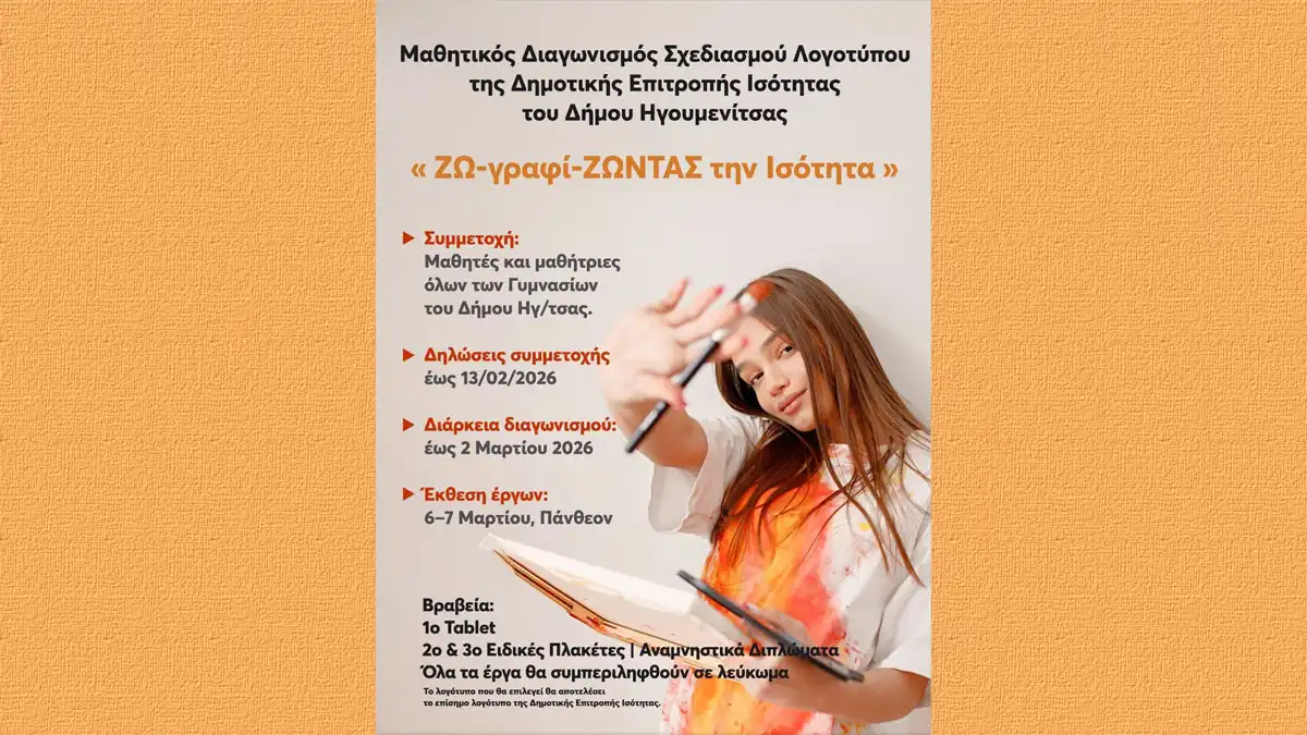Η Δημοτική Επιτροπή Ισότητας του Δήμου Ηγουμενίτσας προκηρύσσει τον μαθητικό διαγωνισμό σχεδιασμού λογοτύπου με τίτλο «ΖΩ-γραφί-ΖΩΝΤΑΣ την ΙΣΟΤΗΤΑ», καλώντας τους μαθητές και τις μαθήτριες όλων των Γυμνασίων του Δήμου μας να ξεδιπλώσουν το ταλέντο τους.