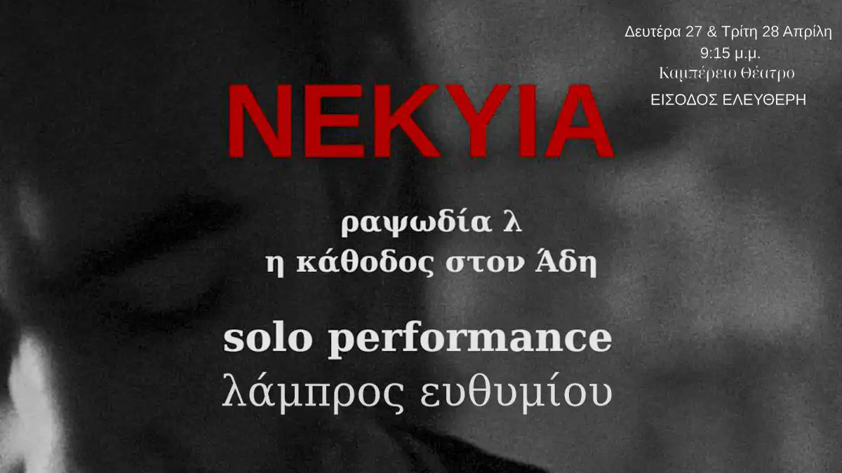 Η «Νέκυια» θα παρουσιαστεί στο Καμπέρειο Θέατρο, σε συνεργασία με το ΔΗΠΕΘΕ Ιωαννίνων, τη Δευτέρα 27 και την Τρίτη 28 Απριλίου 2026, στις 21:15, με ελεύθερη είσοδο.