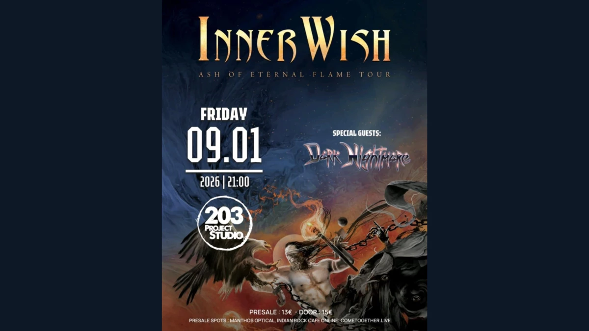 Οι INNERWISH, ένα από τα ιστορικότερα και σημαντικότερα συγκροτήματα της Ελληνικής heavy metal σκηνής, επιστρέφουν μετά από 9 χρόνια στα Ιωάννινα, στο Studio 203, στις 9 Ιανουαρίου (ώρα έναρξης: 21:00).