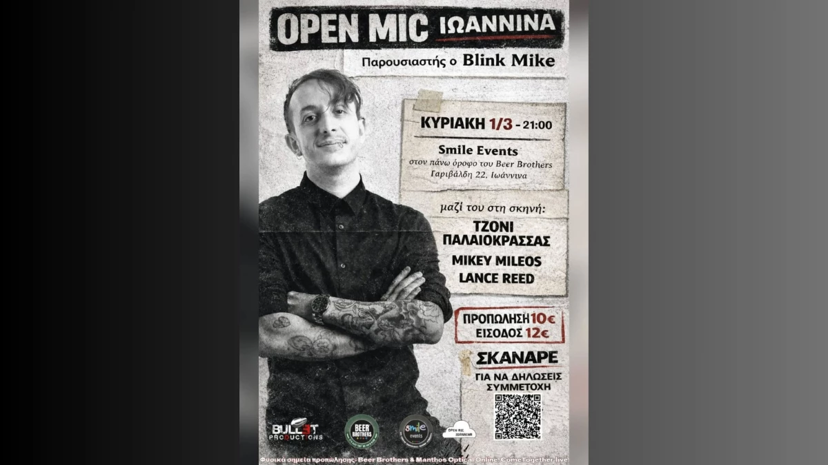 Το Open Mic Ioannina σε συνεργασία με τη Bullet Productions παρουσιάζει μια δυνατή βραδιά stand-up την Κυριακη 1 Μαρτίου στις 21:00 στο Smile Events (πάνω όροφος Beer Brothers).