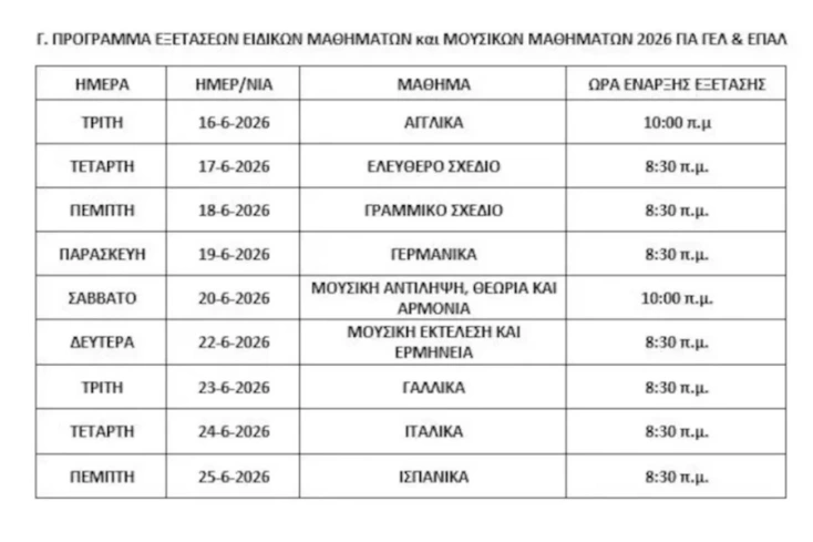 Οι Πανελλήνιες 2026 για τα ημερήσια και τα εσπερινά ΕΠΑΛ ξεκινούν το Σάββατο 30 Μαΐου με το μάθημα των Νέων Ελληνικών και συνεχίζονται την Τρίτη 2 Ιουνίου με τα Μαθηματικά (Άλγεβρα).