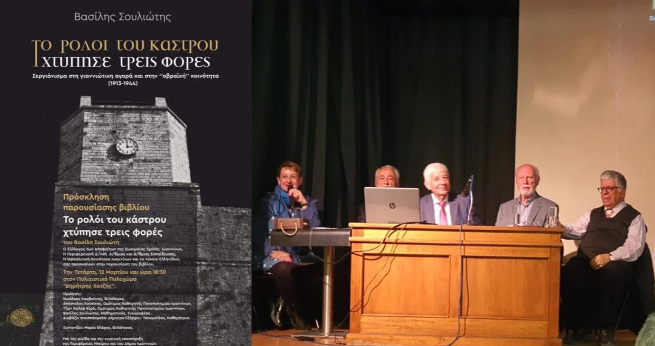 Με μεγάλο ενδιαφέρον έλαβε χώρα η παρουσίαση του βιβλίου του απόφοιτου της Ζωσιμαίας Σχολής Βασίλη Σουλιώτη “Το ρολόι του Κάστρου χτύπησε τρεις φορές” που διοργανώθηκε στην αίθουσα «Δημήτρης Χατζής» στα Ιωάννινα από τον Σύλλογο Αποφοίτων Ζωσιμαίας Σχολής με συνδιοργανωτές την Περιφερειακή Δ/νση Α/θμιας και Β/θμιας Εκπαίδευσης, την Ισραηλιτική Κοινότητα Ιωαννίνων και το Λύκειο Ελληνίδων.