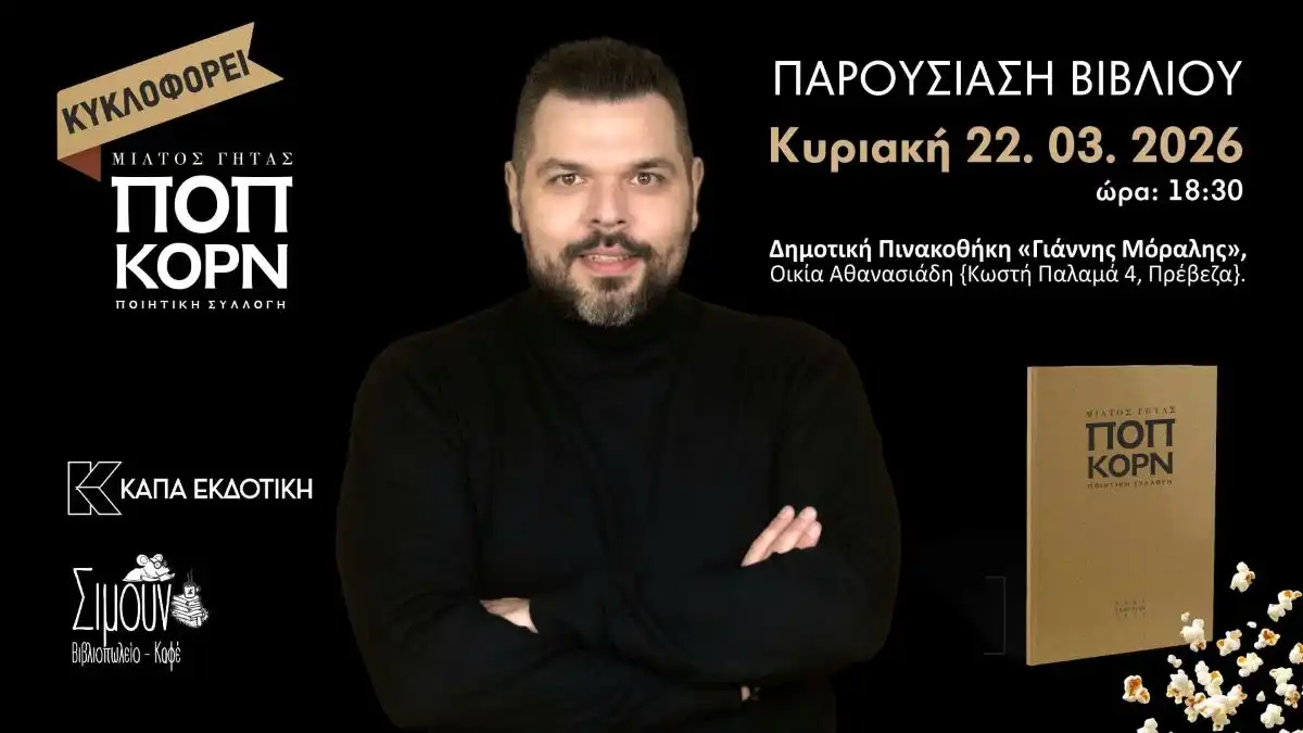 Ο Σύλλογος «Περί Βιβλίου» Πρέβεζας, το βιβλιοπωλείο «Σιμούν» και η Κάπα Εκδοτική διοργανώνουν την παρουσίαση της νέας ποιητικής συλλογής του δημοσιογράφου και ποιητή Μίλτου Γήτα με τίτλο «Ποπ Κορν», την Κυριακή 22 Μαρτίου 2026 στις 18:30, στη Δημοτική Πινακοθήκη «Γιάννης Μόραλης» στην Πρέβεζα (Οικία Αθανασιάδη, Κωστή Παλαμά 4).