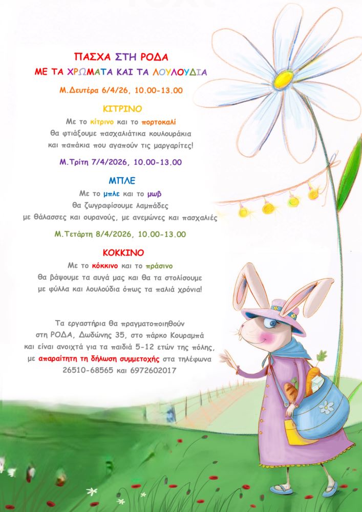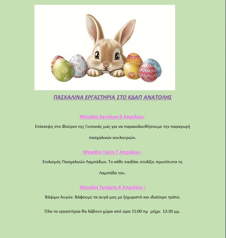 Οι πασχαλινές εκδηλώσεις περιλαμβάνουν εργαστήρια κατασκευών, παιχνίδια και δραστηριότητες εμπνευσμένες από το πνεύμα των ημερών, ενισχύοντας τη φαντασία, τη συνεργασία και τη χαρά της συμμετοχής.