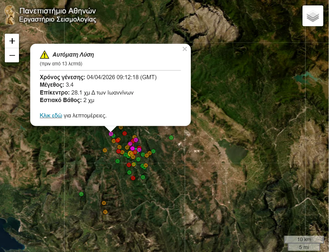 Σεισμική δόνηση μεγέθους 3,4 βαθμών της κλίμακας Ρίχτερ σημειώθηκε το πρωί του Σαββάτου 4 Απριλίου 2026 στις 12:12 ώρα Ελλάδας, με επίκεντρο 28,1 χιλιόμετρα δυτικά των Ιωαννίνων.