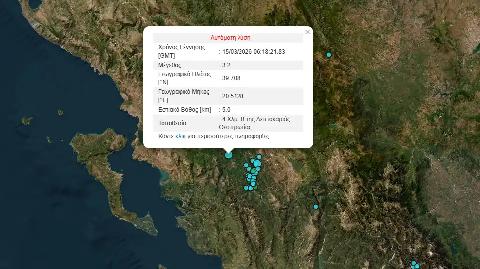 Σεισμική δόνηση μεγέθους 3,2 βαθμών της κλίμακας Ρίχτερ σύμφωνα με την αρχική εκτίμηση, καταγράφηκε το πρωί της Κυριακής στην περιοχή της Θεσπρωτίας, προκαλώντας αισθητή αναστάτωση σε περιοχές της Ηπείρου. Στις 08:36 ακολούθησε ακόμη ένας σεισμός μεγέθους 2,4 Ρίχτερ.