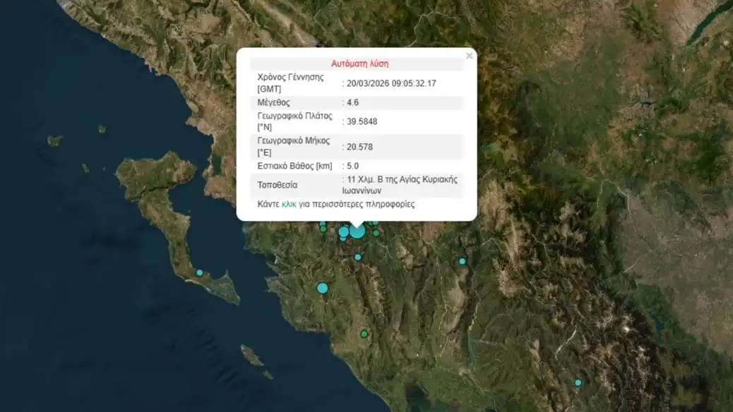 Αρκετά ισχυρή σεισμική δόνηση μεγέθους 4,6 Ρίχτερ καταγράφηκε το πρωί της Παρασκευής 20 Μαρτίου 2026 στις 11:05, με επίκεντρο 10 χιλιόμετρα βορειοανατολικά της Αγίας Κυριακής Ιωαννίνων – το επίκεντρο στην συνέχεια άλλαξε και ορίστηκε στα 10 Χλμ. νότια-νοτιανατολικά της Λεπτοκαριάς Θεσπρωτίας – προκαλώντας αναστάτωση στην ευρύτερη περιοχή.