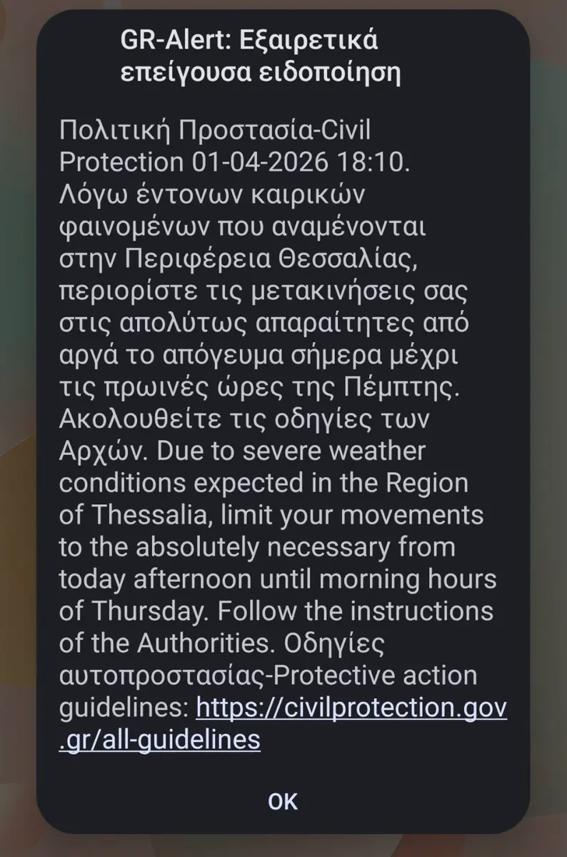 Σύμφωνα με πληροφορίες, πρόκειται για λανθασμένη αποστολή του μηνύματος, καθώς το 112 ενεργοποιήθηκε εκτός της γεωγραφικής ζώνης που είχε αρχικά προγραμματιστεί.