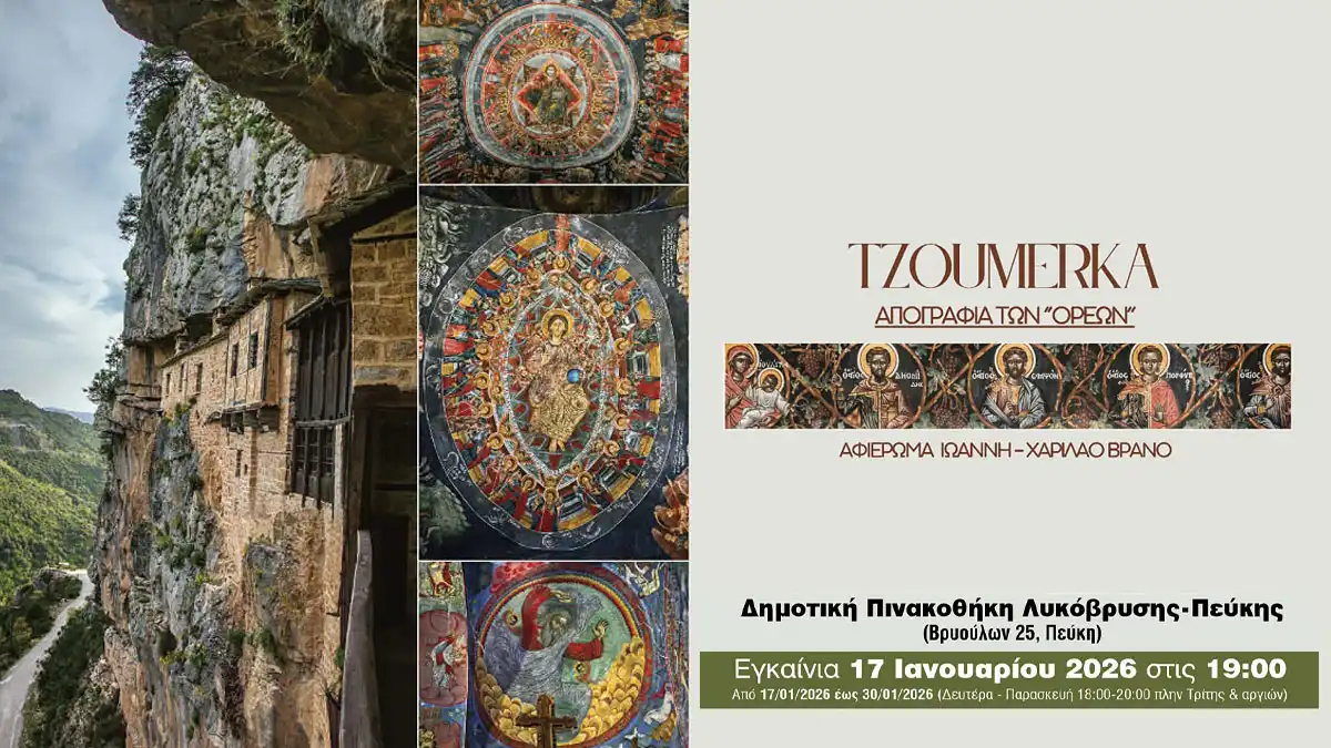 Η έκθεση «Tzoumerka – Αγιογραφία των “Ορέων”» στον Δήμο Λυκόβρυσης – Πεύκης προσφέρει στο κοινό της Αττικής την ευκαιρία να γνωρίσει από κοντά τον πλούτο της ηπειρώτικης τέχνης και της αγιογραφικής παράδοσης, πριν η έκθεση επιστρέψει στα Ιωάννινα και καταλήξει στην ορεινή περιοχή που γέννησε αυτή τη μοναδική καλλιτεχνική έκφραση.